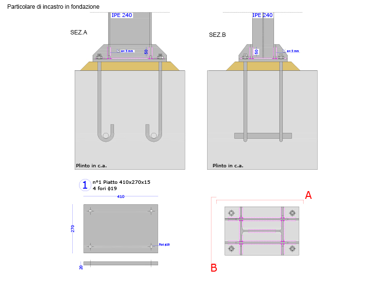 Dettaglio costruttivo: Collegamento pilastro in acciaio-fondazione in c.a.